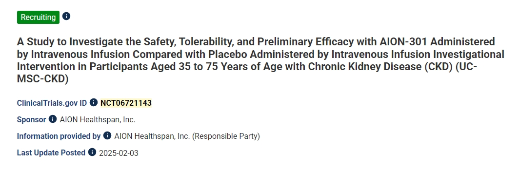 這項(xiàng)研究(NCT06721143),目前正在邁阿密大學(xué)衛(wèi)生系統(tǒng)進(jìn)行,正在按計(jì)劃評(píng)估AION健康保險(xiǎn)公司研究細(xì)胞療法的安全性、耐受性和早期療效信號(hào)。該公司宣布,第一位患者已經(jīng)成功接受了兩種預(yù)定的輸注,這標(biāo)志著正在進(jìn)行的臨床計(jì)劃中的一個(gè)重要里程碑。