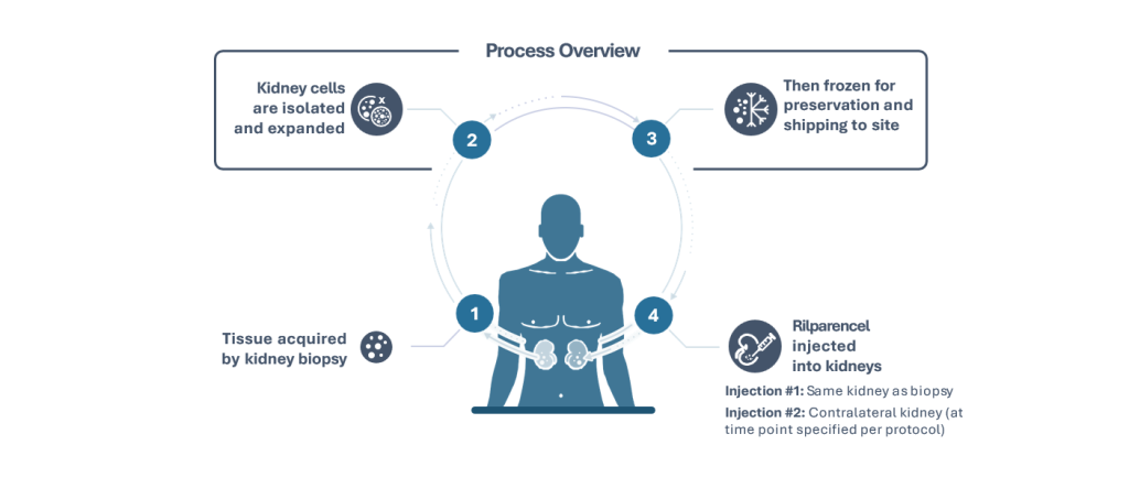 Rilparencel是一種經(jīng)皮微創(chuàng)注射的自體細(xì)胞療法產(chǎn)品,由患者自身的腎臟細(xì)胞在體外擴(kuò)增后制備而成。正是由于其自體來源的特性,患者接受治療后無需終生服用免疫抑制劑來防止排斥反應(yīng)。