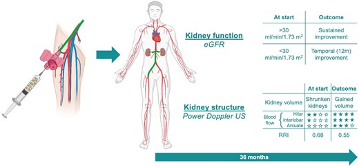 2個月時的彩色多普勒評估表明,每個評估的腎臟 (36/36) 的葉間和/或弓狀動脈灌注水平增加,肺門動脈 (35/36) 腎臟的阻力指數降低。超過12個月,初始eGFR<30mL/min/1.73m的患者2惡化,而那些≥30mL/minute/1.73m2進一步維持其腎功能,表明該組可能具有腎臟保護作用。