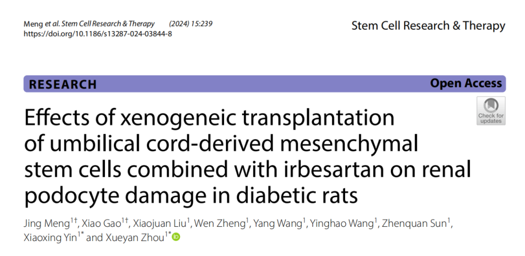 2024年,徐州醫科大學周雪妍教授/印曉星教授課題組在《Stem Cell Research & Therapy》(SCRT)上發表了題為“Effects of xenogeneic transplantation of umbilical cord-derived mesenchymal stem cells combined with irbesartan on renal podocyte damage in diabetic rats”的研究。[1]