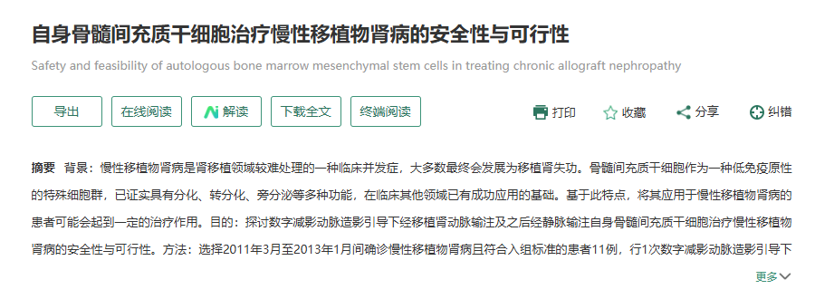 2014年8月6日,廣州醫(yī)科大學(xué)附屬第二醫(yī)院聯(lián)合東莞市人民醫(yī)院發(fā)表了一篇自身骨髓間充質(zhì)干細(xì)胞治療慢性移植物腎病的安全性與可行性的文章。[1]