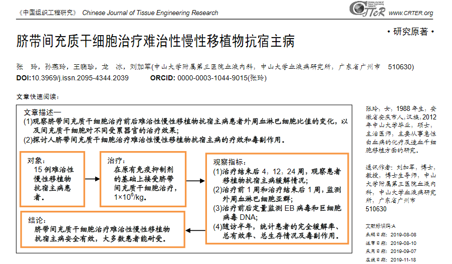 臨床案例:發表在《中國組織工程研究》雜志的一篇臨床研究成果,中山大學附屬第三醫院采用臍帶間充質干細胞治療15例造血干細胞移植后難治性慢性移植物抗宿主病患者,研究結果顯示:臍帶間充質干細胞療法的有效率為73.3%,輸注期間未發現明顯不良反應,干細胞治療安全有效。