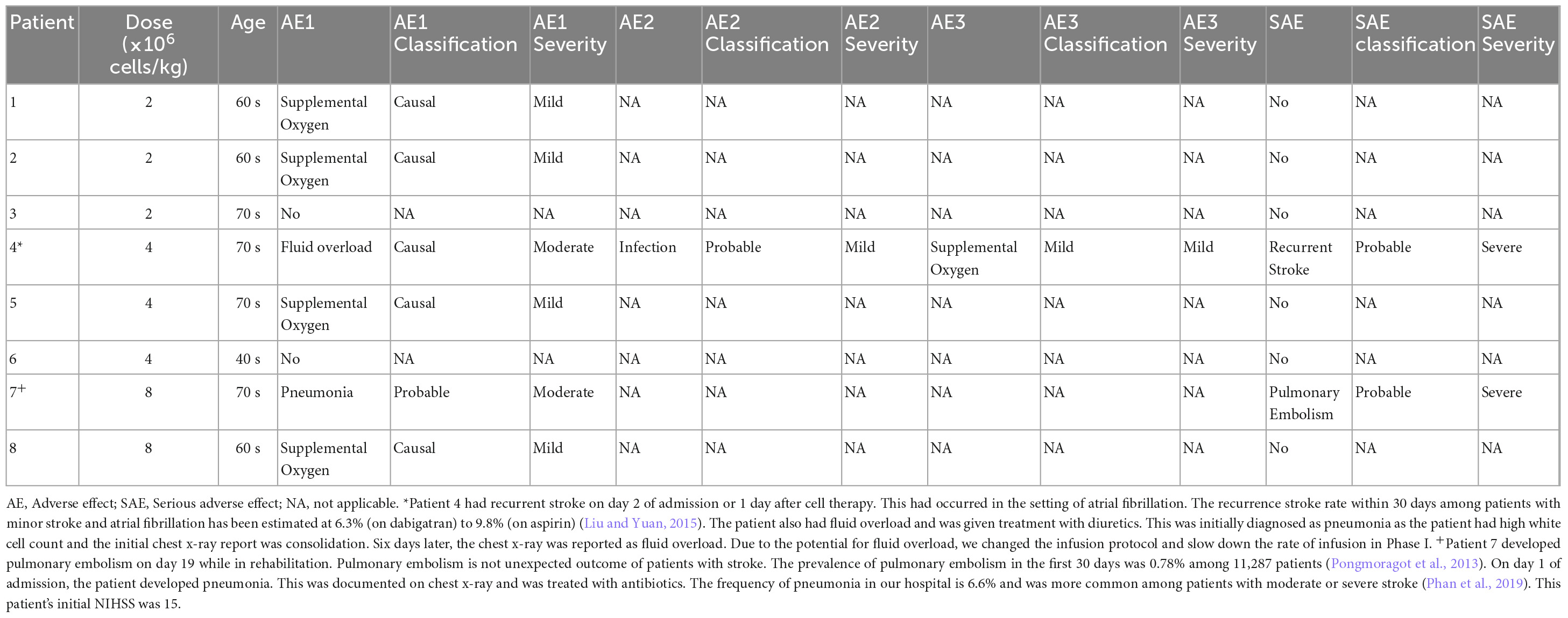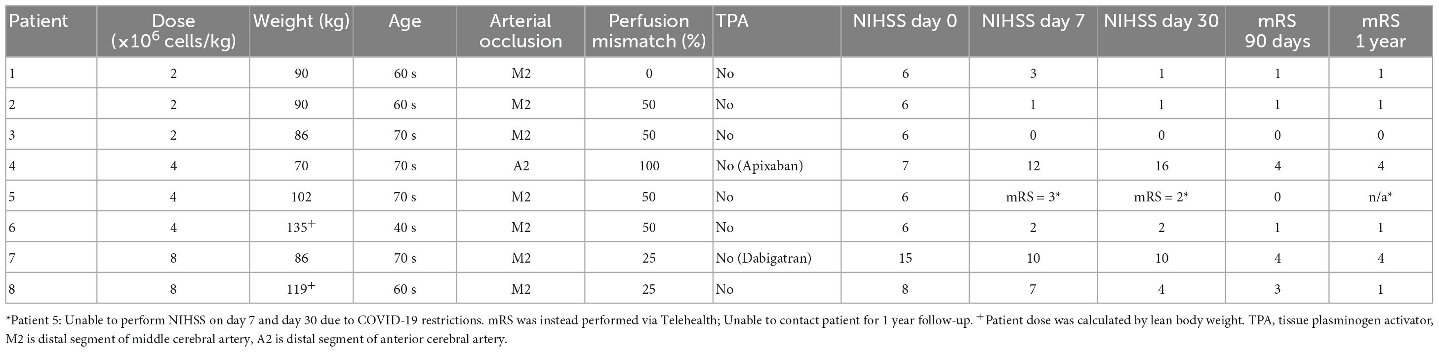 結果:8名患者(6名男性)在缺血性中風發作24小時內被招募,并接受hAEC輸注。我們能夠將hAEC的劑量增加至8×10^6個細胞/kg(2×10^6/kg,n=3;4×10^6/kg,n=3;8×10^6/kg,n=2)。平均年齡為68.0±10.9(平均值±標準差)。高血壓、高脂血癥的發生率為87.5%,糖尿病為37.5%,房顫為50%,缺血性心臟病為37.5%,曾經吸煙者為25%。