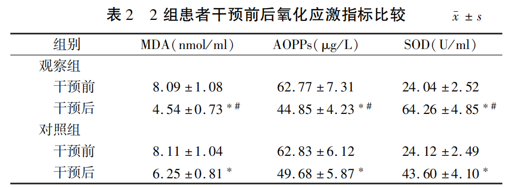 (3)氧化應激指標:采集2組患者治療前后的空腹靜脈血3ml,3000r/min離心機中離心10min取血清,采用酶聯免疫吸附 (ELISA)檢測MDA、AOPPs、SOD水平。?