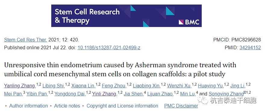 2021,浙江大學醫學院附屬邵逸夫醫院婦產科輔助生殖科張等人提供的研究中,選擇了17名患有Asherman綜合征的女性,作者嘗試通過膠原支架/臍帶間充質干細胞(CS/UC-MSC)移植來再生子宮內膜組織并提高懷孕機會,看看這種療法是否可以幫助那些傳統方法沒有效果的人。(該論文發表在干細胞研究與治療雜志上)