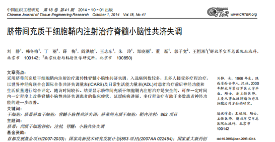 本研究證明間充質干細胞鞘內注射治療是安全的,可以一定程度地改善共濟失調及MSA-C患者的臨床癥狀,提高患者生活質量。