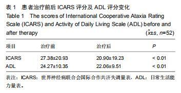 38例脊髓小腦性共濟失調患者52個療程治療中,44個療程有效,有效率為84.6%, 38例脊髓小腦性共濟失調患者52個療程治療結束1個月與治療前比較,ICARS、ADL評分差異均有顯著性意義。
