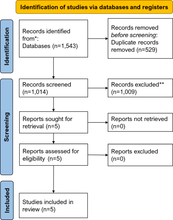 搜索結果和篩選:總體而言,通過數據庫搜索找到了1,543篇文章。在刪除重復項后,在標題/摘要階段篩選出1,014項研究,其中5項被考慮在全文階段進行進一步評估,并且所有這些文章均被納入本系統評價(圖1)。