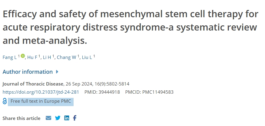 2024年9月,國(guó)際期刊雜志《胸腔疾病雜志》刊發(fā)了一篇“間充質(zhì)干細(xì)胞治療急性呼吸窘迫綜合征的療效和安全性——系統(tǒng)評(píng)價(jià)和薈萃分析”臨床研究文獻(xiàn)綜述。