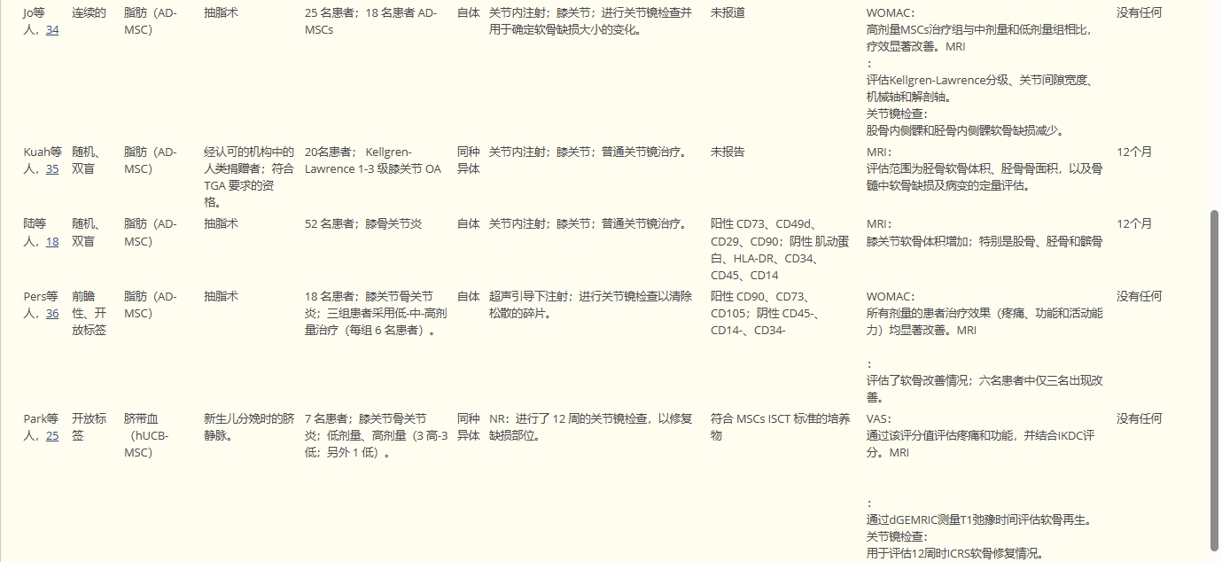 所有納入研究均聚焦于膝骨關節炎(OA)患者,他們接受了主要通過關節內注射的間充質干細胞(MSCs) 治療(部分研究聯合關節鏡),旨在改善膝關節損傷狀況;