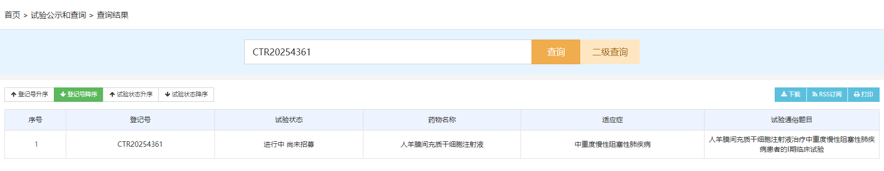 11月5日,藥物臨床試驗登記與信息公示平臺數據顯示,源品細胞生物科技集團有限公司的一項評價人羊膜間充質干細胞注射液治療中重度慢性阻塞性肺疾病患者的安全性、耐受性及有效性的I期臨床試驗已啟動。臨床試驗登記號為CTR20254361,首次公示信息日期為2025年11月5日。[12]
