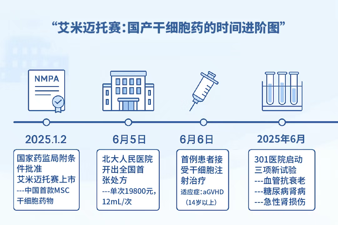 2025年1月2日,國家藥監(jiān)局通過優(yōu)先審評(píng)審批程序,附條件批準(zhǔn)艾米邁托賽注射液上市。這款藥物核心成分是人臍帶間充質(zhì)干細(xì)胞,符合嚴(yán)格的藥品生產(chǎn)質(zhì)量管理規(guī)范(GMP)標(biāo)準(zhǔn)。