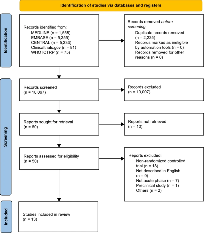 通過系統檢索共篩選10,067篇文獻(流程圖見圖1),初步納入60項研究進行全文評估。經嚴格審查后排除:9項非英/日語報告、18項非RCT研究、7項未納入急性/亞急性缺血性卒中患者的研究、2項因其他原因不符及1項臨床前研究。最終,13項RCT符合納入標準,共涉及872例患者(男性519例,女性353例),構成了本次薈萃分析的核心證據庫。