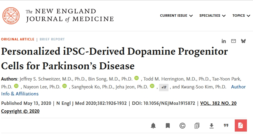 首例自體細(xì)胞移植實踐:2020年在《新英格蘭醫(yī)學(xué)雜志》上發(fā)表了一篇“個性化iPSC衍生多巴胺祖細(xì)胞治療帕金森病”的研究報告,這是全球首例開展的自體誘導(dǎo)多能干細(xì)胞移植治療帕金森病的臨床試驗。試驗報告了將患者來源的中腦多巴胺能祖細(xì)胞植入一名特發(fā)性帕金森病患者的案例,通過分階段向患者雙側(cè)殼核立體定向植入400萬自體源多巴胺神經(jīng)元。