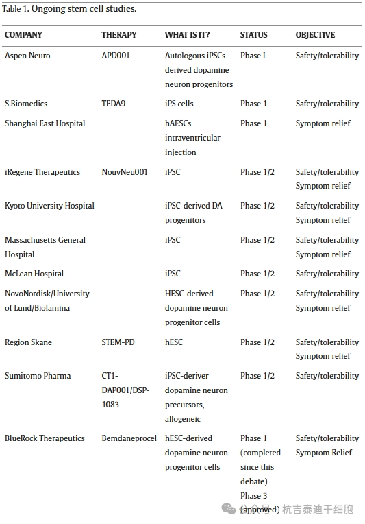 表1:正在進(jìn)行的干細(xì)胞治療帕金森病的研究