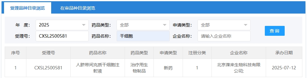 新增受理9:2025年07月12號,北京葆來生物科技有限公司申報的“人臍帶間充質干細胞注射液”的臨床試驗獲受理(受理號:CXSL2500581),這是該款細胞注射液第1次獲得受理。