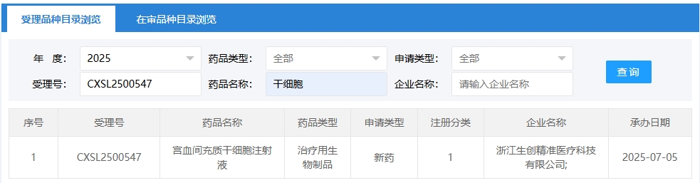新增受理5:2025-07-05,浙江生創精準醫療科技有限公司申報的“宮血間充質干細胞注射液”的臨床試驗申請獲受理(受理號:CXSL2500547),這是該細胞注射液第4次獲得受理。