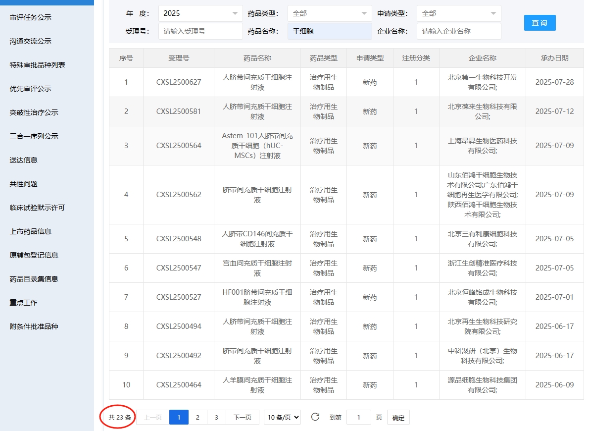 2025年以來,共有23款干細胞藥物臨床試驗申請獲得受理。