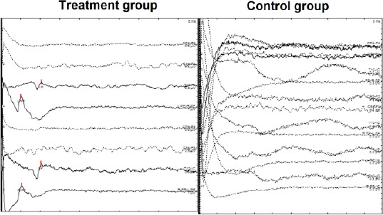 圖1:與對照組相比,治療組肌電圖 (EMG) 的變化。記錄治療組的肌電圖 (EMG) 并與未治療組進行比較。結果在肌肉機電表上顯示了一些運動單元