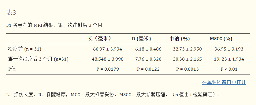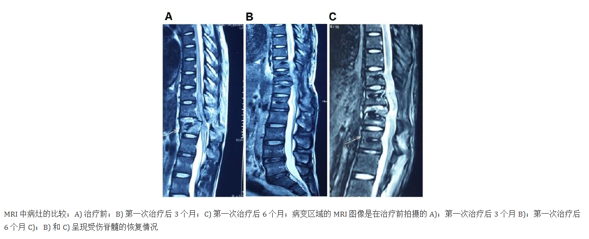結果:所有患者的運動功能、膀胱功能和日常生活都有改善。沒有患者報告有任何副作用。MRI成像顯示椎管病變長度明顯改變,脊髓增粗。心理改善在移植后六個月最高,在移植后一個月最低。治療后生活質量改善的患者比例為100%,而80%的患者對治療結果感到滿意。