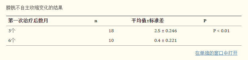 根據不自主膀胱收縮、最大膀胱壓力 (Pdetmax) 和最大膀胱容積 (VH2Omax) 的顯著變化,記錄了神經源性膀胱的變化(表4)。