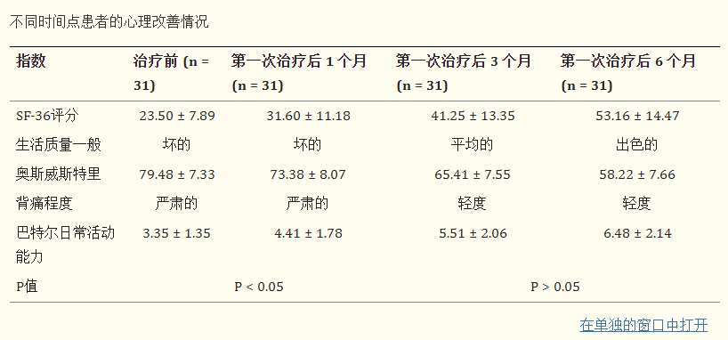 SF-36結果顯示,患者的總體生活質量由差轉為好,而通過Oswestry問卷測得的影響患者日常活動的背痛發生率由嚴重轉為輕度。第一次治療后6個月,Barthel ADL增加到3分(表6)。治療后6個月內未報告副作用。