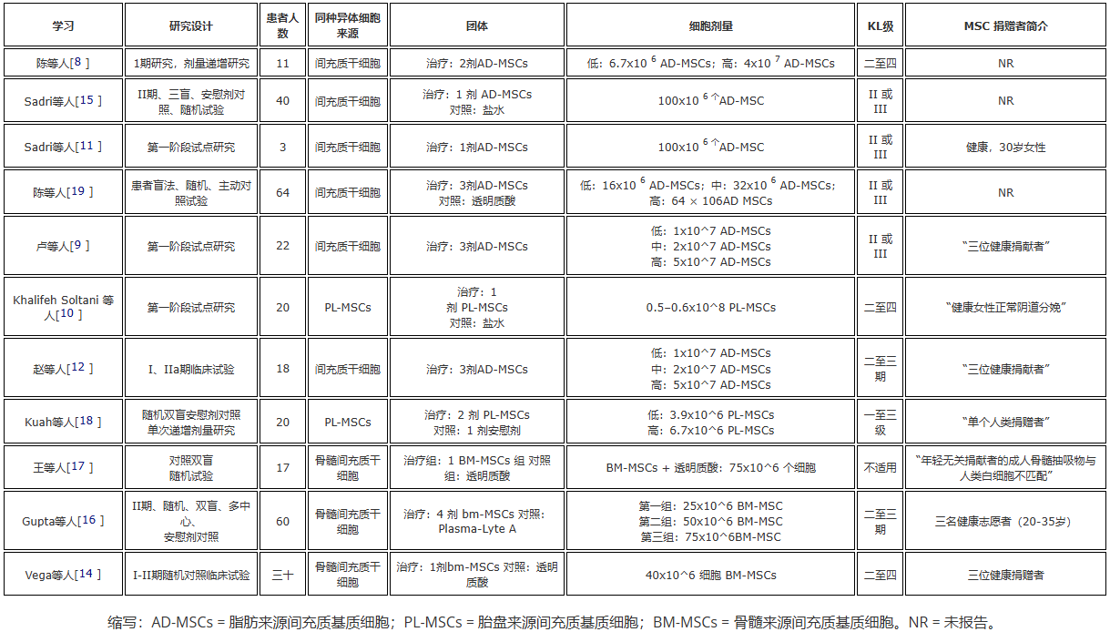 二、研究概述:11項試驗揭示注射間充質干細胞治療膝骨關節炎的潛力