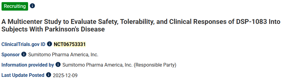 [1]:1.Kayhanian S, Barker RA. Clinical trial highlights: Dopamine cell-replacement therapies. Journal of Parkinson’s Disease. 2025;0(0). doi:10.1177/1877718X251397277.