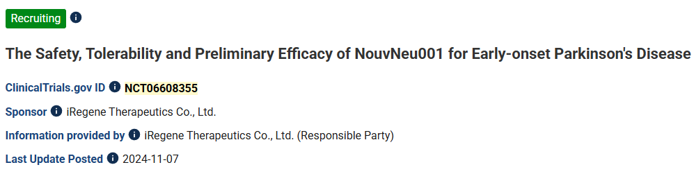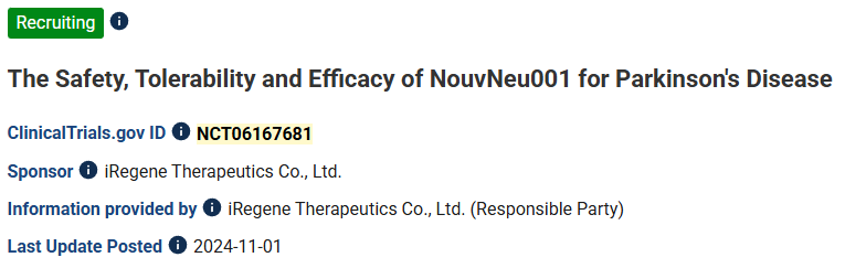 11、標題:NouvNeu001治療帕金森病的安全性、耐受性和有效性