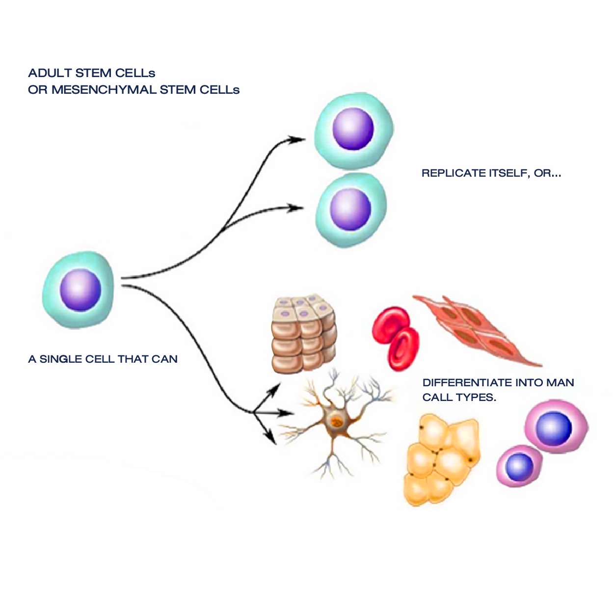 成體干細胞或間充質干細胞被稱為是多能干細胞,這意味著它們只能變成體內的某些細胞,而不是任何細胞,例如: