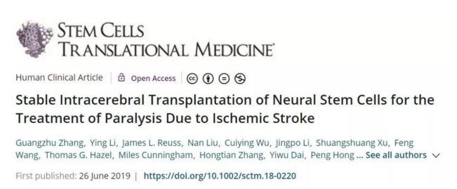目前該研究課題進展順利,值得一提的是,該臨床研究團隊關于神經干細胞治療缺血性腦卒中的Ⅰ期臨床研究結果,已經于2019年6月26日發表在《干細胞轉化醫學》國際期刊上。Ⅰ期臨床研究結果反響良好,顯示出一種特殊的人源神經干細胞系對于偏癱性中風(身體的一側無力或癱瘓)后運動功能恢復的治療潛力。