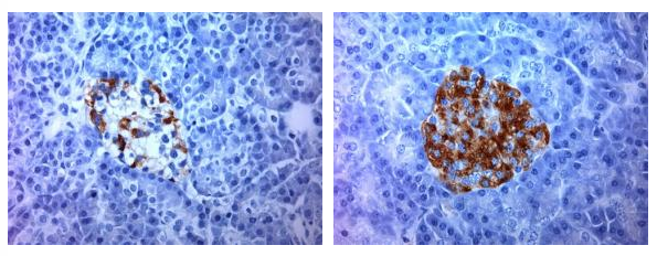 在左圖中,我們可以看到制造的胰島素減少(以棕色顯示)和腫脹,因為β細胞受損。