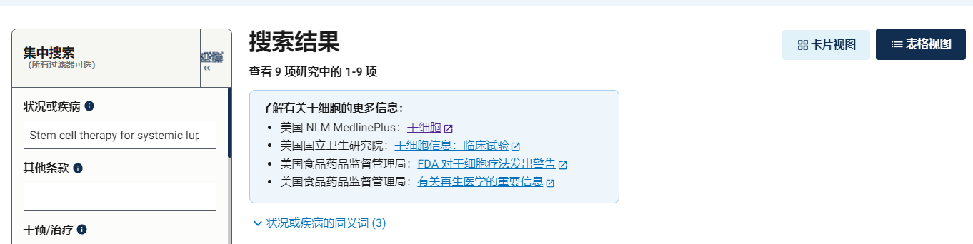 據ClinicalTrials.gov (https://clinicaltrials.gov) 報道,目前使用干細胞治療系統性紅斑狼瘡的患者的臨床試驗9項,另外還有39項針對其他相關自身免疫性疾病的臨床試驗。