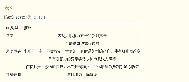 通常,CP是根據(jù) Ingram和Hagbergs分類法進行分類的;然而,歐洲腦癱監(jiān)測 (SCPE) 已將CP簡化為痙攣型、共濟失調型和運動障礙型(表3) 。