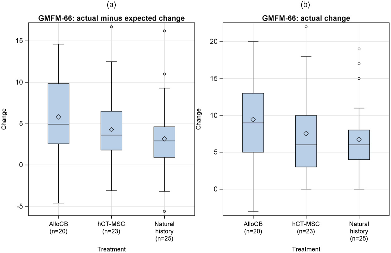 (a) 研究的主要結(jié)果是GMFM-66從基線到第12個(gè)月的實(shí)際減去預(yù)期變化。平均變化(和95%置信區(qū)間)為 5.8 (3.4–8.2)、4.3 (2.2–6.4 ),同種異體臍帶血 (AlloCB)、人臍帶組織來(lái)源的間充質(zhì)基質(zhì)細(xì)胞 (hCT-MSC) 和自然歷史臂分別為 3.1 (1.4–5.0)。