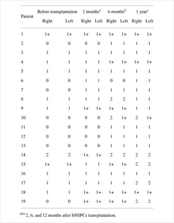總的來說,只有一名患者(患者14)似乎在上肢和下肢都有臨床上明顯的痙攣,這影響了日常生活的活動。然而,在細胞植入之前,他的下肢肌肉張力已經明顯增加,而且他的痙攣狀態在1年多的時間里并沒有通過藥物得到很好的控制。其他在隨訪期間發生痙攣或肌張力增加的患者并未表現出嚴重的痙攣。他們的痙攣狀態通過藥物得到緩解,并且對他們的日常生活活動沒有顯著影響。