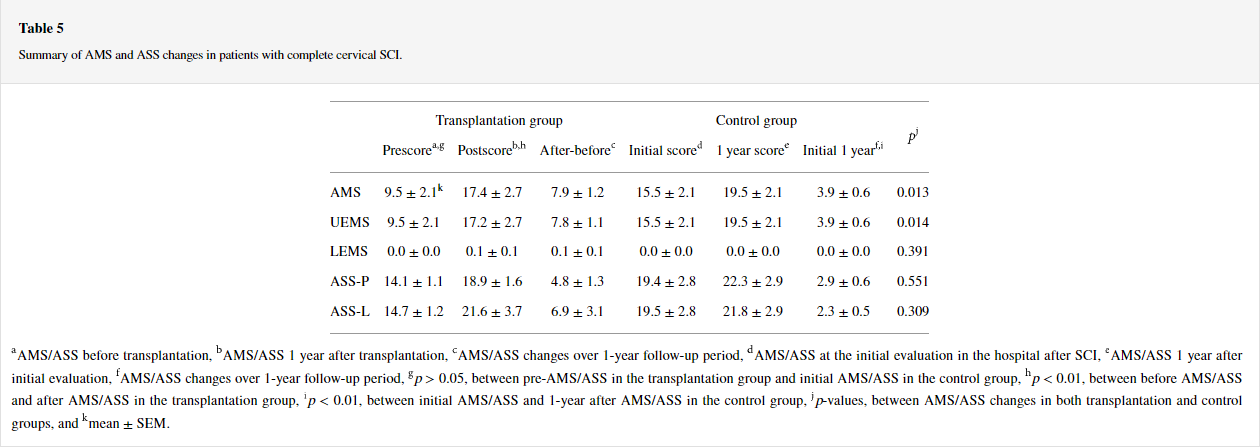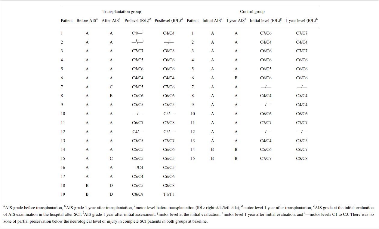 因此,與對照組相比,移植組中AIS-A患者在1年時恢復了一個或多個運動水平的比例更高。在基線時,兩組完全SCI患者的神經損傷水平以下沒有部分保留區域。