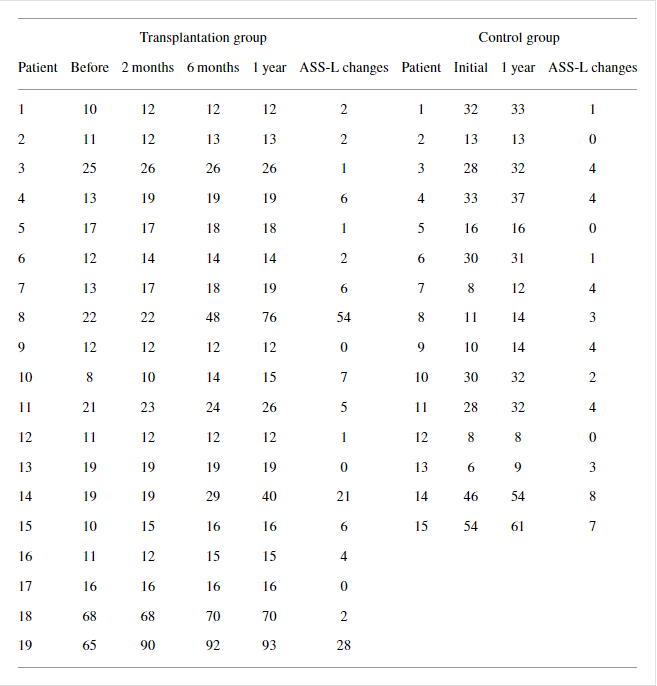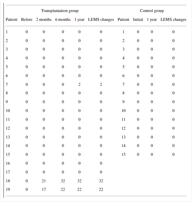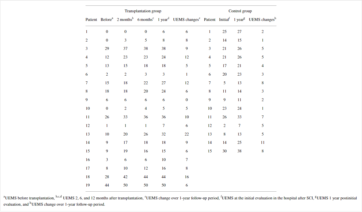 然而,分別轉換為AIS-C和AIS-B的患者7和8在移植后1年分別顯示LEMS增加2分和ASS-L增加54分(表7和9)。在不完全性SCI中,與對照組相比,移植組中的兩名患者在1年時表現出更大的LEMS和ASS-P增加(表6–9)。