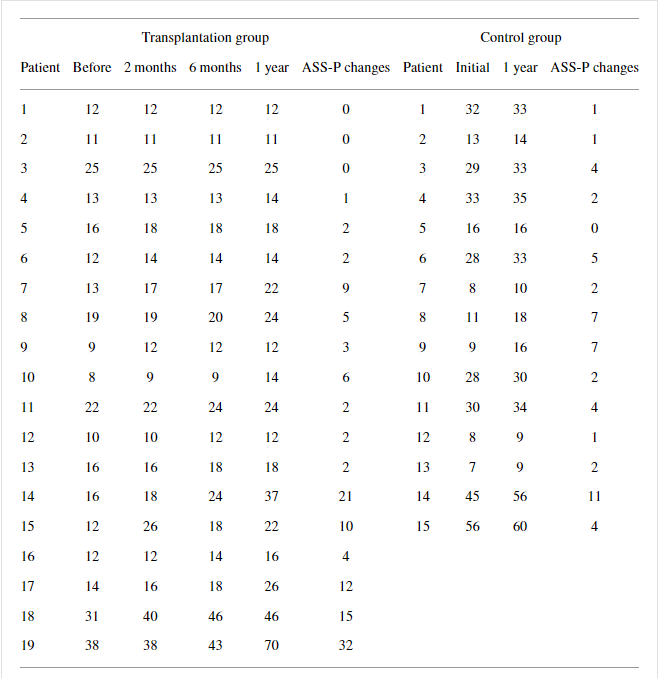 然而,移植組UEMS超過 1 年的平均變化顯著大于對照組(對比; ),而ASS-P和ASS-L超過1年的平均變化在兩組中沒有顯著差異(表5)。在移植組的AIS-A患者中,AIS分級轉換與AMS和ASS超過1年的變化之間沒有明顯的相關性。