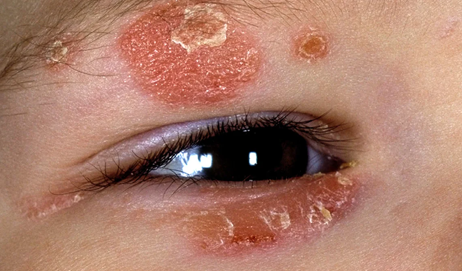 死亡的細胞會迅速轉移到皮膚外層并堆積起來,形成覆蓋著片狀銀色鱗屑的褪色斑塊。皮膚還會發炎。
