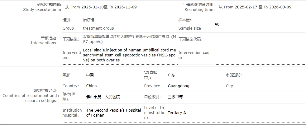 臨床試驗一:人臍帶間充質干細胞來源的凋亡囊泡(MSC-apoVs)治療早發性卵巢功能不全的臨床研究(佛山市第二人民醫院)