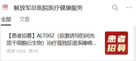 近日,解放軍總醫(yī)院第一醫(yī)學(xué)中心(即常說(shuō)的“301醫(yī)院”)兒科發(fā)布一項(xiàng)臨床研究招募信息,宣布開(kāi)展 ALT002(應(yīng)激誘導(dǎo)的間充質(zhì)干細(xì)胞衍生物) 用于治療孤獨(dú)癥譜系障礙(ASD) 的臨床研究。該研究已通過(guò)倫理審查,現(xiàn)面向社會(huì)招募符合條件的患兒。