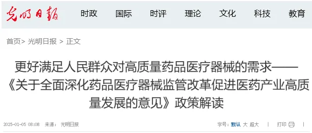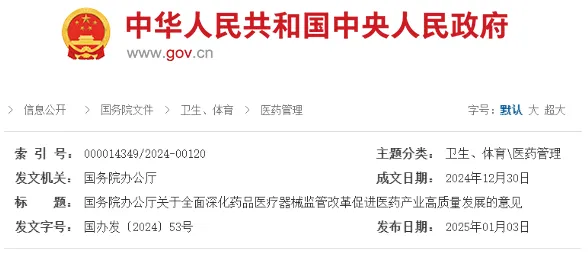 2025年1月3日,國務院辦公廳發(fā)布了《關于全面深化藥品醫(yī)療器械監(jiān)管改革促進醫(yī)藥產(chǎn)業(yè)高質量發(fā)展的意見》(國辦發(fā)〔2024〕53號)。國家藥監(jiān)局相關負責人表示,意見的出臺將深化藥品醫(yī)療器械監(jiān)管全過程改革,加快構建全國統(tǒng)一大市場,打造全球競爭力的創(chuàng)新生態(tài),助力我國從制藥大國向制藥強國跨越。