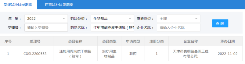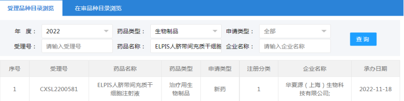 2022年7月28日上海泉生生物科技有限公司“人臍帶間充質干細胞注射液”(受理號:CXSL2200341)無法查到IND評審信息。