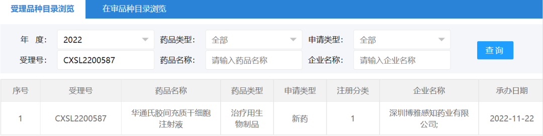 2022年11月22日,深圳博雅感知藥業有限公司“華通氏膠間充質干細胞注射液”的藥物臨床試驗申請獲受理(受理號:CXSL2200587)。這是深圳博雅感知藥業第一款受理的干細胞藥物。