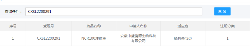 安徽中盛溯源生物科技有限公司的“NCR100注射液”(誘導多能干細胞來源的間充質干細胞)的藥物臨床試驗申請獲得默示許可(受理號:CXSL2200291),適應證為:膝骨關節炎。