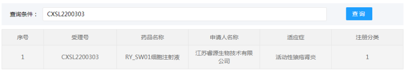 江蘇睿源生物技術有限公司的“RY_SW01細胞注射液”(間充質干細胞藥物)的藥物臨床試驗申請獲得默示許可(受理號:CXSL2200303),適應證為:活動性狼瘡腎炎。