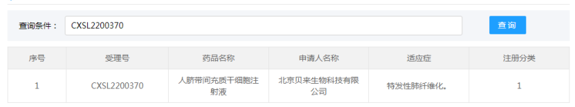北京貝來生物科技有限公司的“人臍帶間充質干細胞注射液”的藥物臨床試驗申請獲得默示許可(受理號:CXSL2200370),適應證為:特發性肺纖維化。