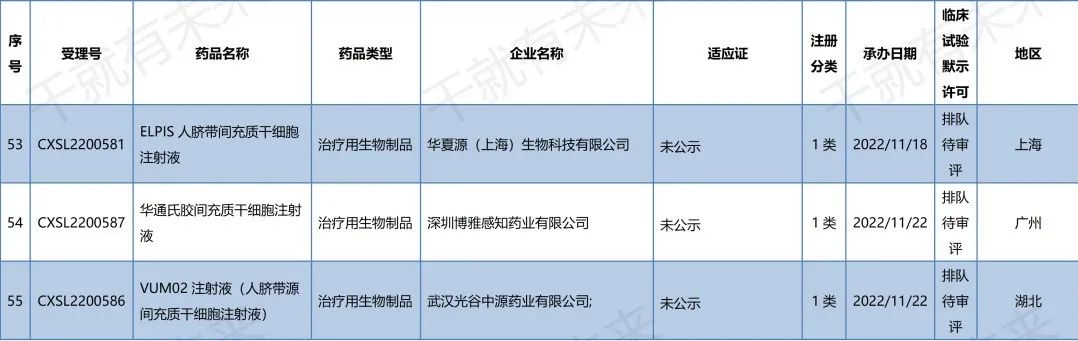 2022年9月1日至11月30日,國內新增7家企業的7款干細胞藥物臨床試驗申請獲得受理;新增6款干細胞藥物通過默示許可。